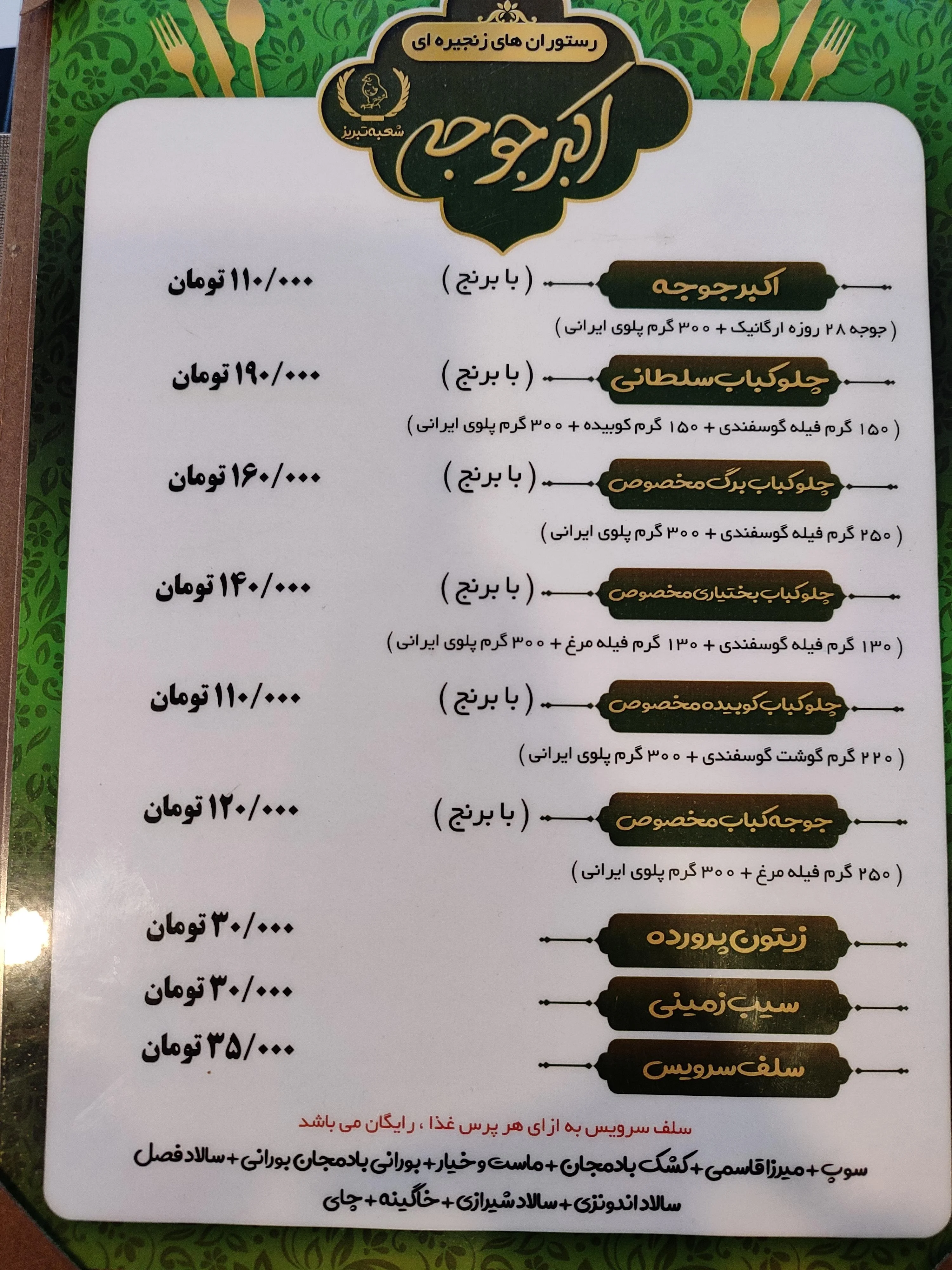 رستوران اکبر جوجه بامزه تبریز، تأسیس ۱۳۹۳، ارائهدهنده غذاهای شمالی و اکبرجوجه با سبک متفاوت. بیش از ۲۰ نوع غذای خاص. دارای پیک، پارکینگ اختصاصی و صندلی کودک.