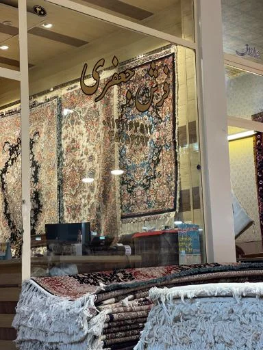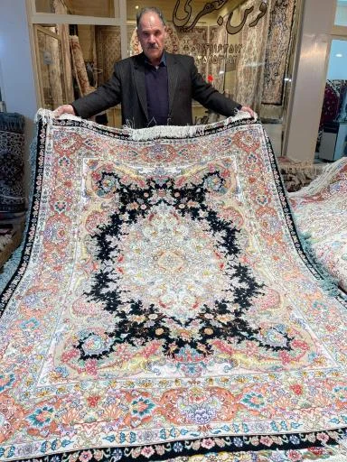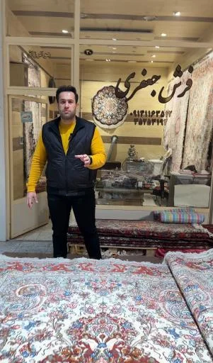 عرضهکننده فرشهای دستباف شامل طرحهای ماهی، علیا و کریمقلم در بازار بزرگ.